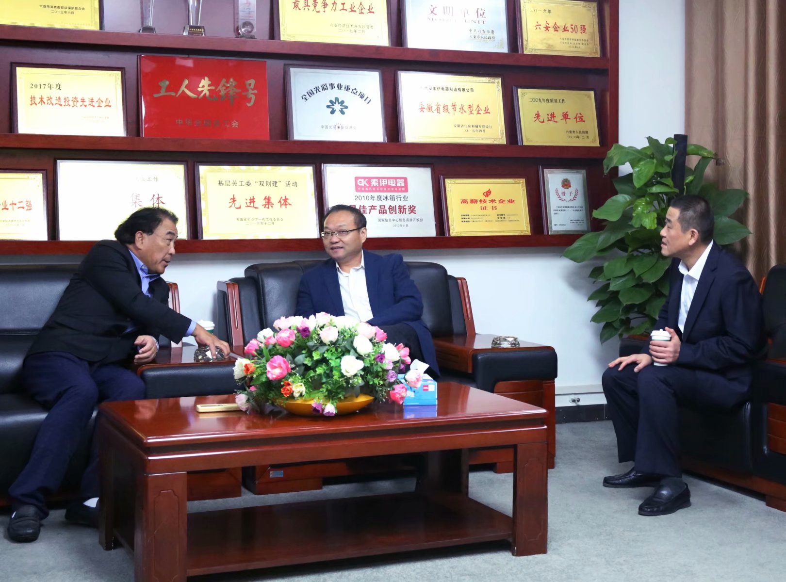 會前副市長束學(xué)龍與上海愛餐機器人有限公司創(chuàng)始人、董事長何青、安徽索伊集團董事長王瓊峰交流。