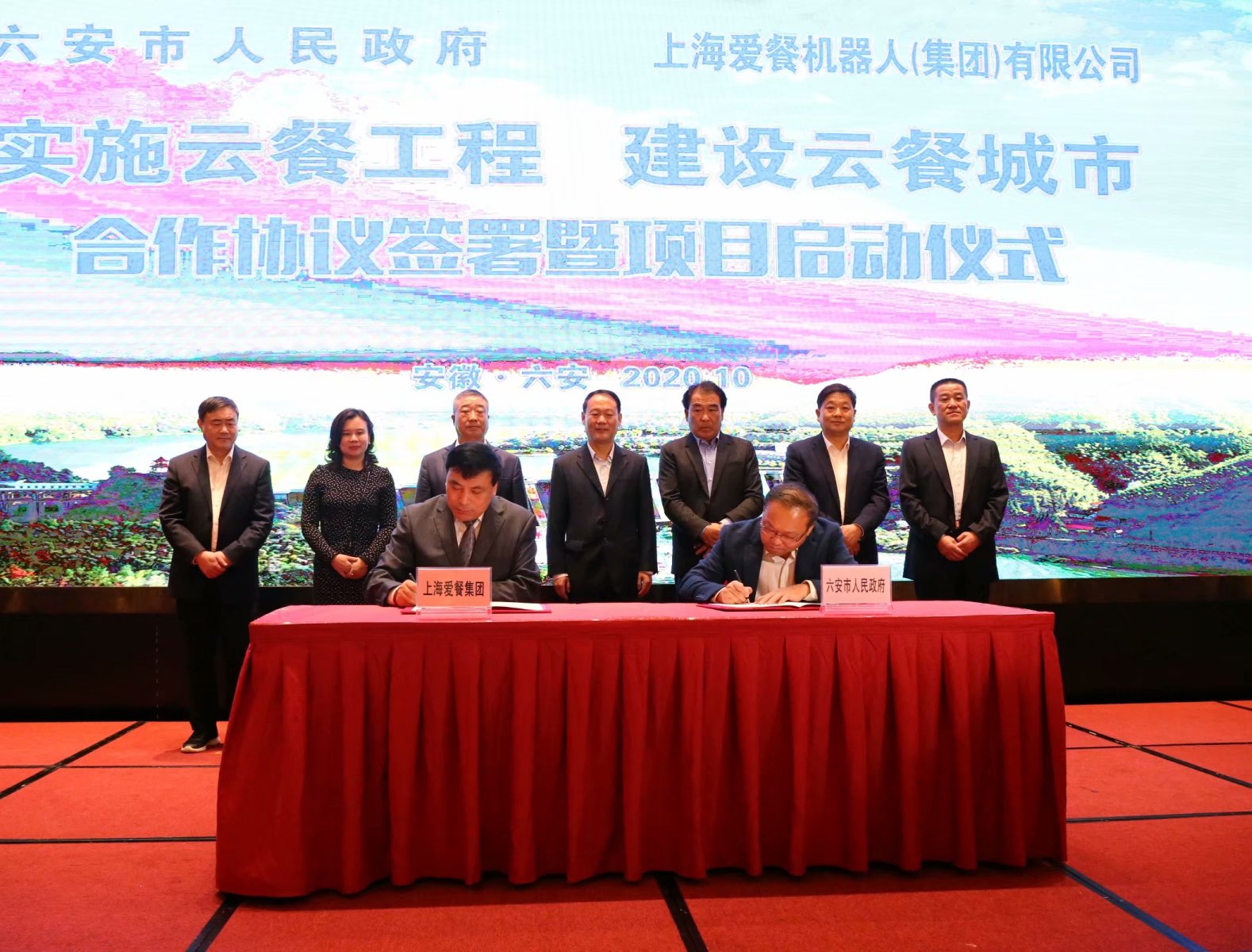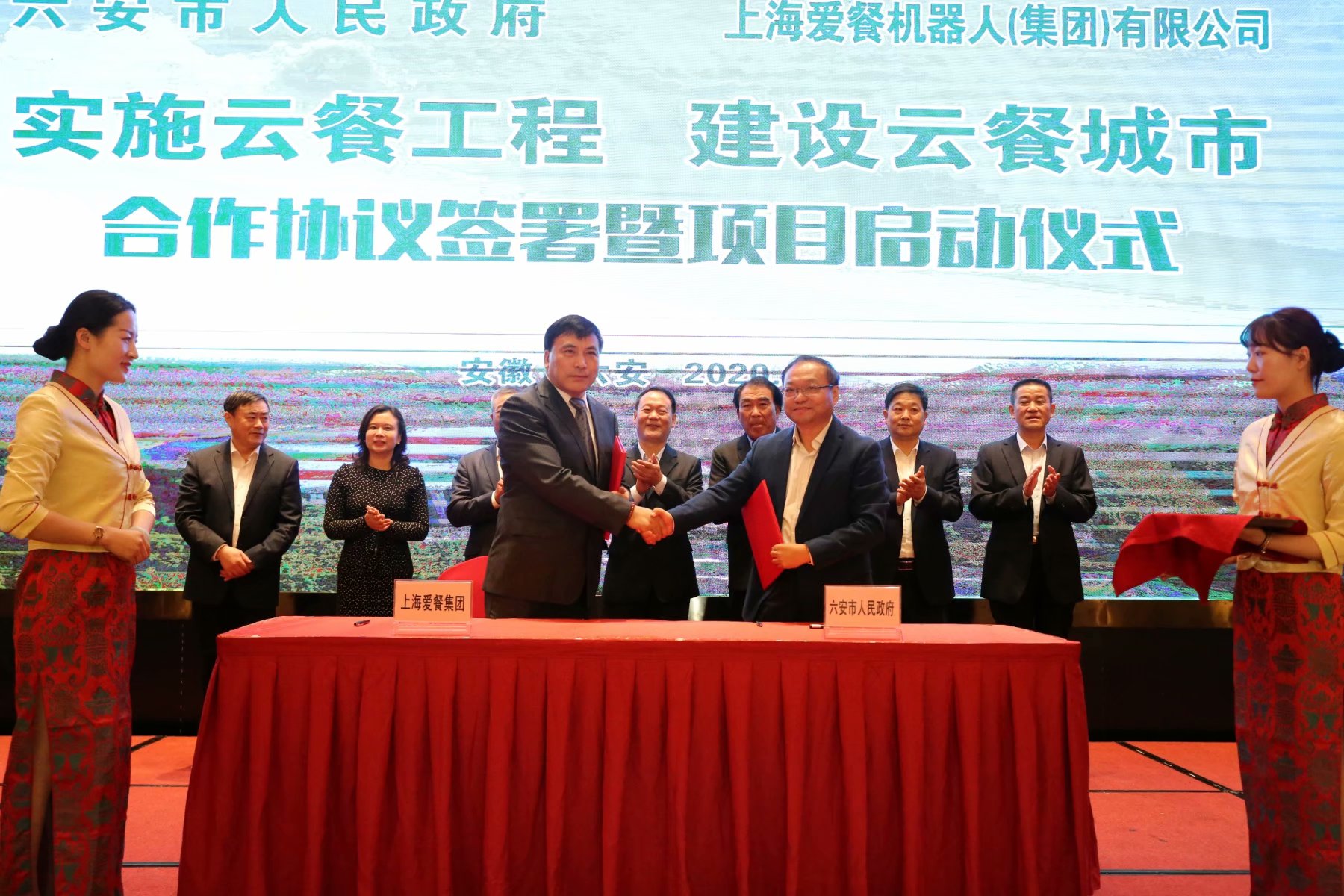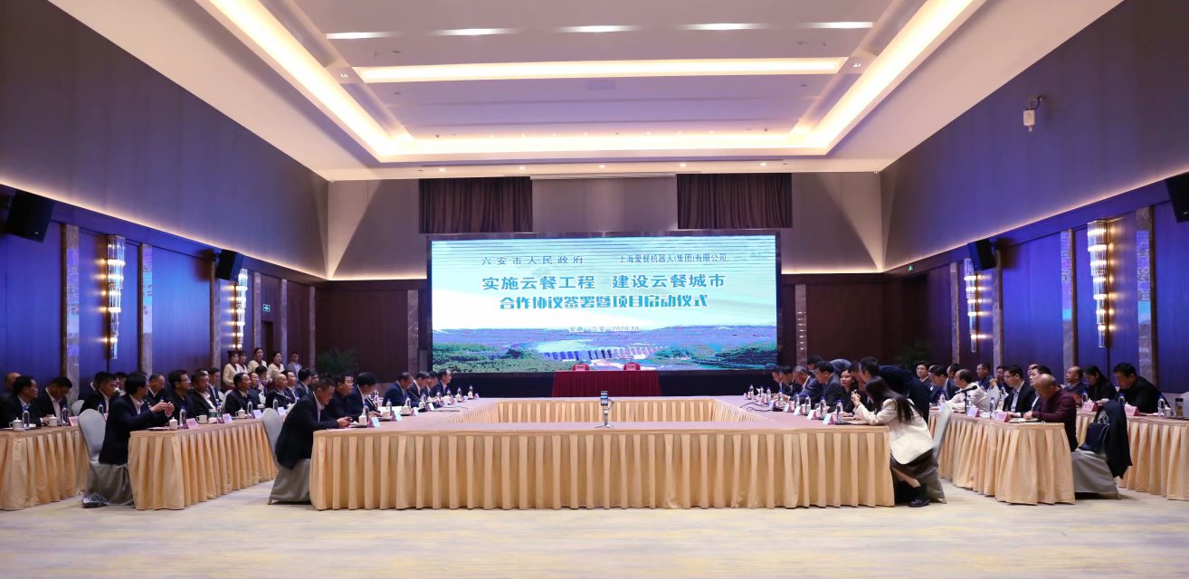 六安市人民政府副市長束學(xué)龍與上海愛餐機器人有限公司總裁何光共同簽署合作協(xié)議,市委副書記、市長葉露中、愛餐機器人創(chuàng)始人、董事長何青、六安開發(fā)區(qū)管委會主任盧俊、上海愛餐機人公司董事何志光、總裁辦主姚國冠、六安市人民政府秘書長陸純、安徽索伊集團董事長王瓊峰見證簽約儀式